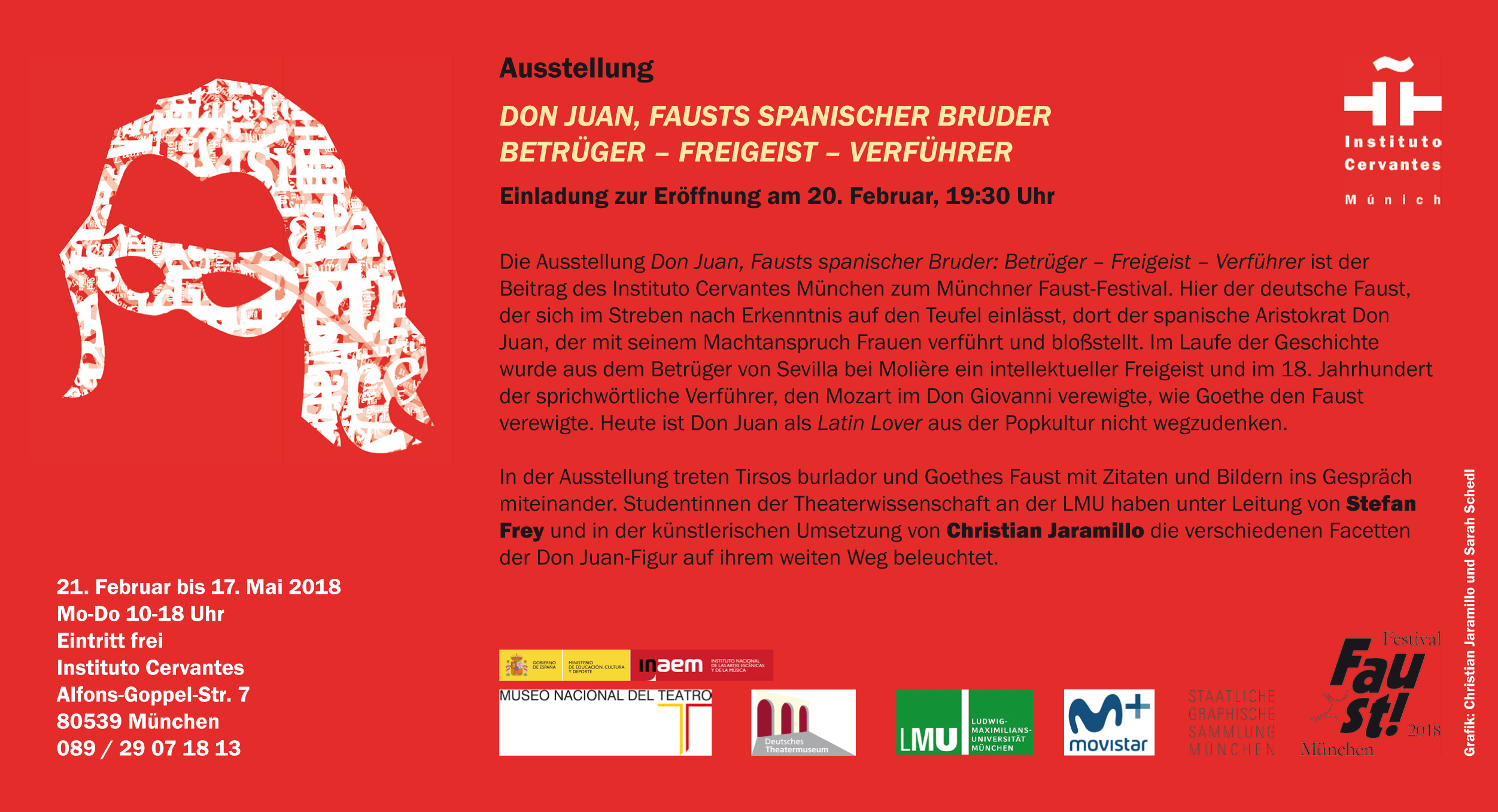 Unter Leitung von Dr. Stefan Frey haben Studierende der TWM eine Ausstellung erarbeitet, die den Don Juan-Mythos mit dem des Faust kontrastiert. Die Ausstellung ist im Rahmen des Seminars Kulturvermittlungspraxis entstanden und Partner des Faust Festivals München 2018.